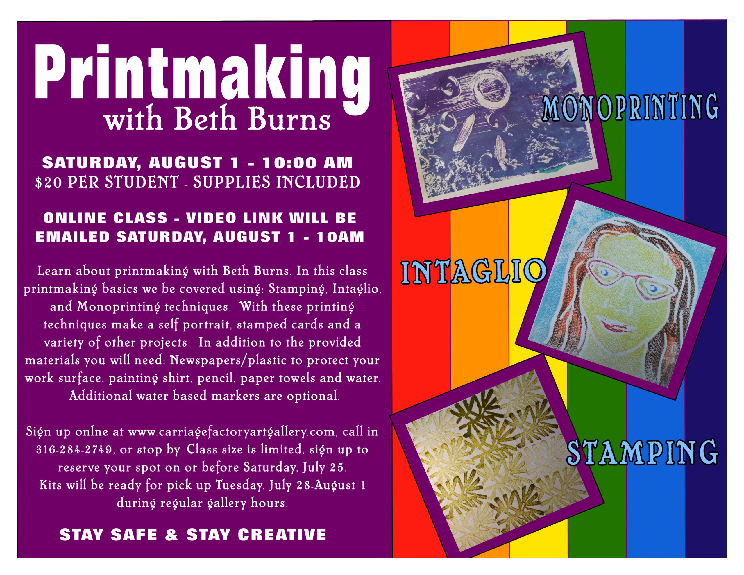 Learn about printmaking with Beth Burns. In this class printmaking basics we be covered using: Stamping, Intaglio, and Monoprinting techniques. With these printing techniques make a self portrait, stamped cards and a variety of other projects. In addition to the provided materials you will need: Newspapers/plastic to protect your work surface, painting shirt, pencil, paper towels and water. Additional water based markers are optional.