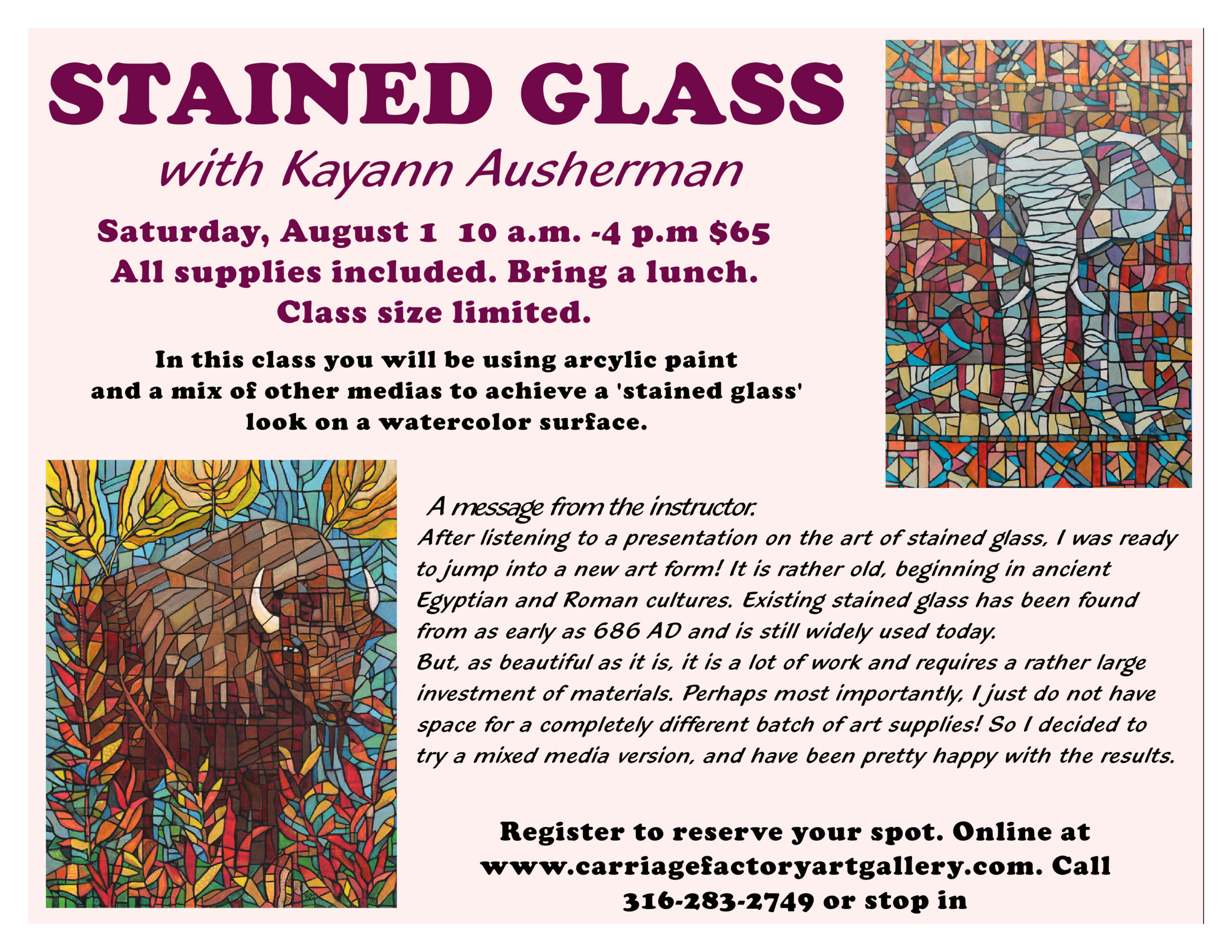 Join instructor Kayann Ausherman in creating a mixed media “Stained Glass” work of art. All supplies included $65. Limited class size so reserve your spot on or before July 25. Bring a sack lunch. Register online at www.carriagefactoryartgallery, call 316-284-2749, or stop in. Please bring a mask.
